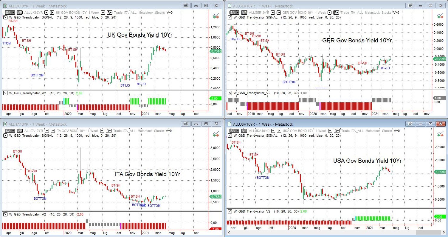 Osservando – a livello di analisi integrata – le curve dei rendimenti dei principali benchmark decennali, osserviamo alcuni movimenti di aggiustamento sui mercati obbligazionari, che non cambiano il quadro generale in ottica strategica, ormai consolidato. Sull’area UK, dopo i massimi relativi sopra area 0,90%, è in corso una correzione che per ora ha riportato il Gilt verso area 0,70% con Trendycator sempre stabile sul LONG. Il BUND, invece, vede rendimenti in salita tornando a testare la resistenza di breve posta a -0,20% di rendimento e con il modello Trendycator che si conferma con stato NEUTRAL. Sempre laterali i rendimenti del nostro Btp, ora a contatto con la resistenza di breve in area 0,80%, livello superiore del trading range 0,50%-0,80% in cui il nostro decennale è inserito da inizio anno; modello Trendycator sempre SHORT. Trova una pausa anche la salita dei rendimenti dell’area USA con il Treasury decennale che dopo essere volato oltre l’1,70% di rendimento è ora in fase correttiva verso area 1,50% e con Trendycator stabilmente LONG.