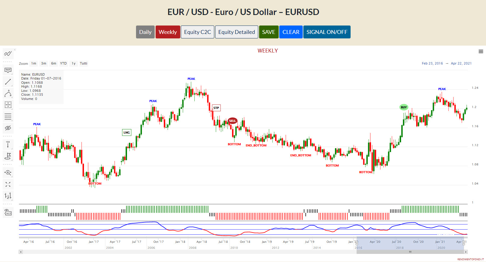 Per ora, quindi, restano aperte le due strade e sarà molto importante anche il comportamento del modello Trendycator. Il suo attuale stato NEUTRAL indica che il pullback non sta avendo la forza di sparigliare e, come già osservato nella scorsa analisi, sotto 1,15 è ragionevole che il Trendycator passi in stato SHORT, dando la stura definitiva all’inversione del trend che ha visto il dollaro soffrire contro euro per quasi un anno.