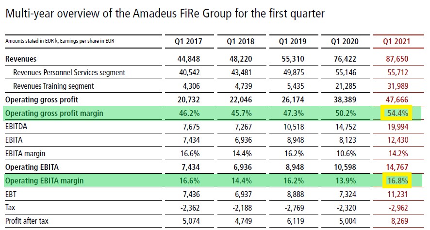 AMADEUS FIRE, nonostante il clima di incertezza, è riuscita a realizzare, nel q1 2021, una performance eccezionale. Tralasciando l'entità dei numeri assoluti (AMADEUS FIRE ha operato alcune importanti acquisizioni che ne hanno aumentato il perimetro), quello che emerge in modo lampante è il netto miglioramento degli indici percentuali di marginalità: nel q1 2021, nonostante il Covid-19, AMADEUS FIRE ha realizzato il record sia della marginalità lorda (54,4%) che del margine operativo EBITA (16,8%).