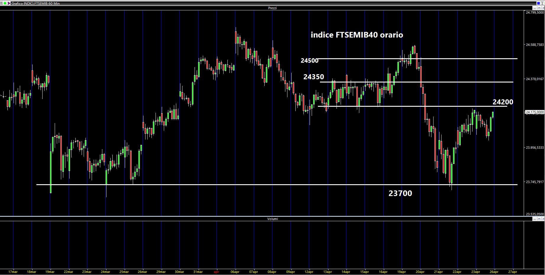 Buon sabato a tutti. Ci siamo salutati con un indice FTSEMIB40 che sembrava stesse ripartendo al rialzo e invece nella seduta di martedì ha avuto una flessione di un paio di punti percentuali, con un affondo sotto la soglia dei 24000 punti. Ex post il supporto dei 24350 è stato rotto come burro (fuso e al sole) in un modo che francamente non mi sarei aspettato. Segno che il mercato è sempre pronto a stupirci. Sul daily tuttavia abbiamo avuto un appoggio sulla media a 50 periodi di colore bianco (chart daily in basso a sinistra). Nella restante parte della settimana abbiamo assistito ad un tentativo di rimbalzo che tuttavia non ha raccolto molti volumi al momento. Come già anticipato nei passati articoli il problema grosso del nostro mercato in questa fase sono proprio i volumi e questo implica che quando esce una notizia ecco che tutti si buttano in massa ad acquistare o a vendere e questo determina appunto dei movimenti improvvisi destinati tuttavia ad esaurirsi abbastanza velocemente. Nella realtà dei fatti ci troviamo comunque in un laterale che si protrare dal mese di marzo di quest'anno ed avente l'area 23650/23700 come supporto e 24650 come resistenza (grafico daily). Tale lateralizzazione avviene in quell'area critica che ho più volte citata e che ha portato generalmente ad un ribasso negli ultimi 15/20 anni e questo impone attenzione e cautela, tanto più che ci avviciniamo a maggio (stacco dividendi etc..).