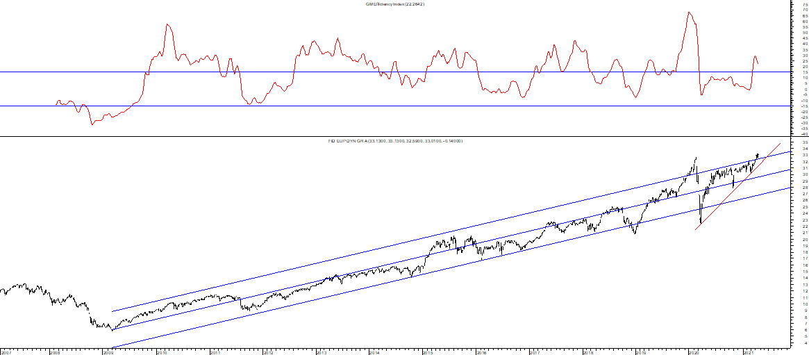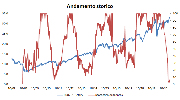 Lo Stocastico orizzontale ci dice che questo “fondo” si è comportato storicamente quasi sempre molto bene rispetto ai suoi concorrenti, mentre il nav è in un canale ascendente dal 2009 e realizza in questi giorni nuovi massimi storici.