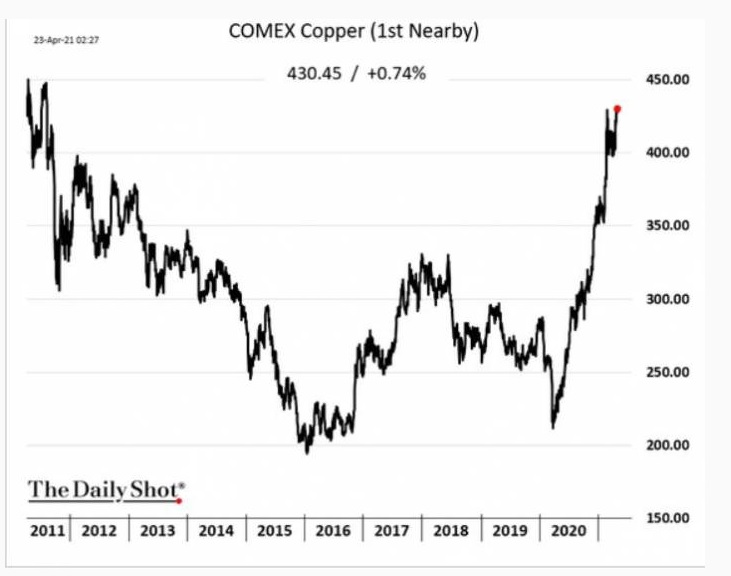 Sta di fatto che se si dice che la materia prima del rame è un indicatore anticipatore del ciclo economico, al punto di sostenere che Dr. Copper ha il PHD in economia, possiamo pubblicare il grafico del rame che dimostra come sia partito come un missile del cielo proprio all’indomani dell’inizio della pandemia. E notiamo che ora sia in fase di breakout del massimo relativo precedente: