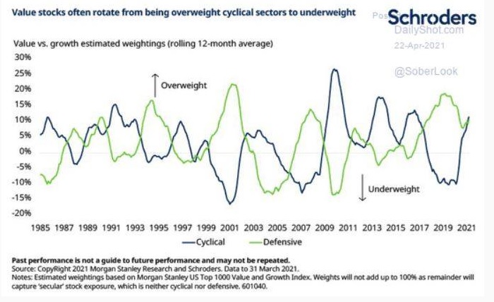 La rotazione tra ciclici e difensivi non è ancora compiuta negli USA e quindi se notate nel grafico che segue le due curve si stanno quasi incrociando cosa che generalmente non è mai sostenibile nel tempo quindi ci aspettiamo che i ciclici continuino a salire e i difensivi a scendere: