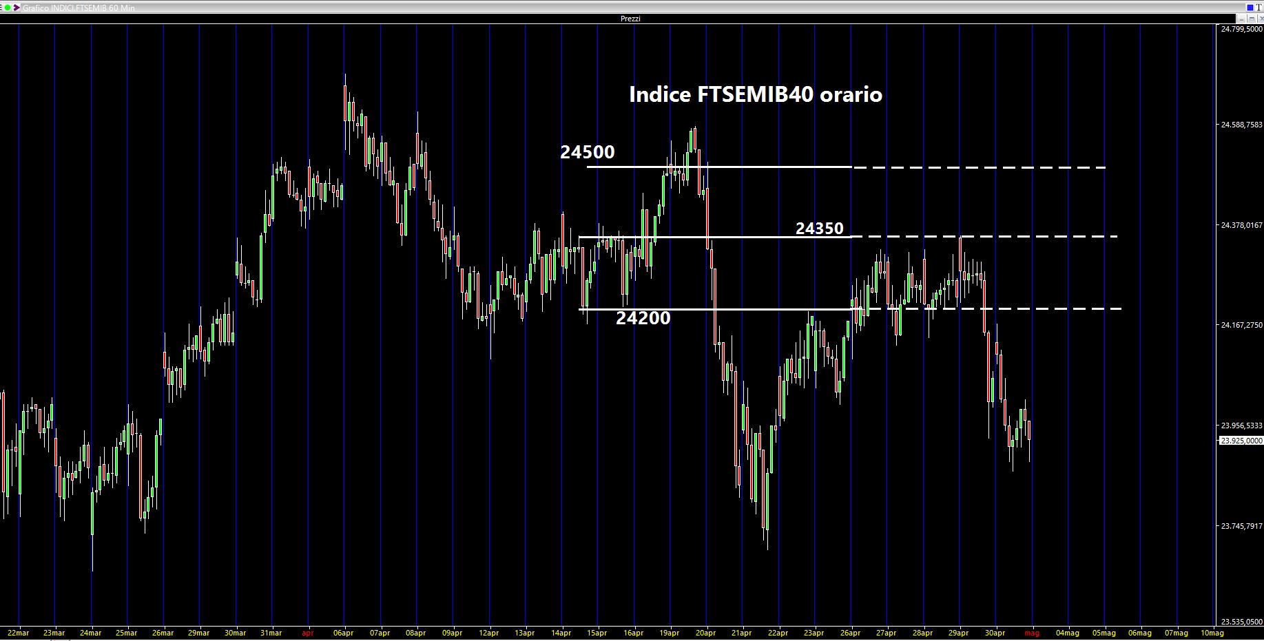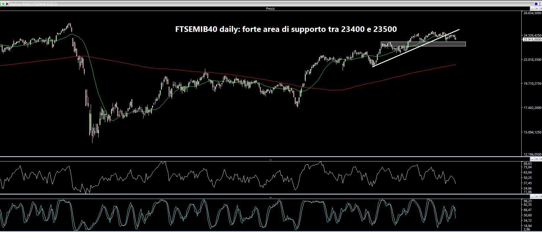 Dall'immagine riportata notiamo che i 24200 hanno costituito un discreto supporto che, una volta rotto, ha portato ad una netta accelerazione ribassista. Di contro i 24350 sono stati il massimo settimanale. Cosa aspettarsi dunque per le prossime sedute? Sul daily abbiamo un'area cuscinetto compresa tra 23400 e 23500 (area rettangolare) in cui è ipotizzabile che l'indice italiano cerchi un appoggio.