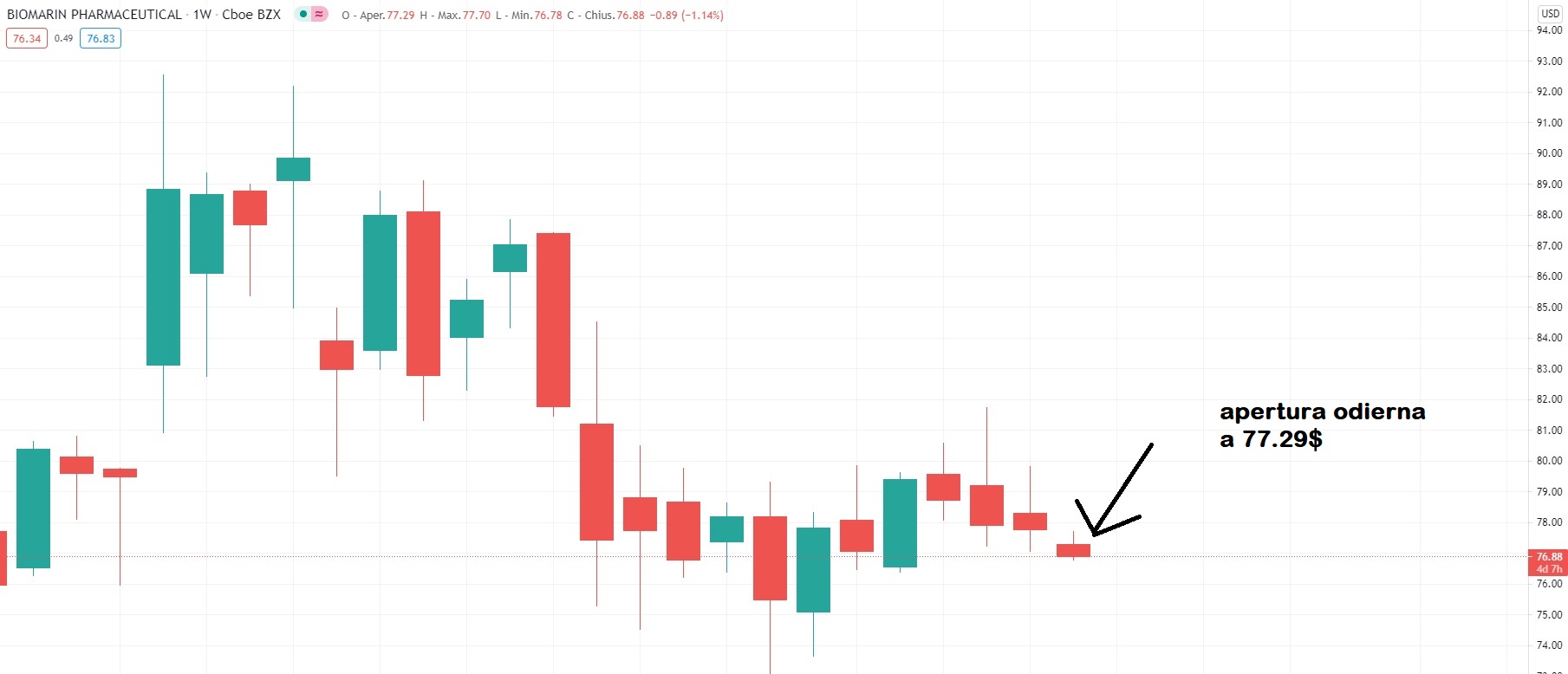 Ad apertura dei mercati nella giornata odierna il titolo segna 77.29 $. Nel nostro portafoglio abbiamo piazzato un ordine buy limit su Biomarin a 75.6$, attendendoci un calo del titolo rispetto alla quotazione corrente ed un conseguente ritracciamento dell’andamento dei prezzi in direzione rialzista nel medio lungo periodo.