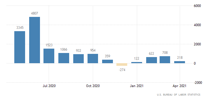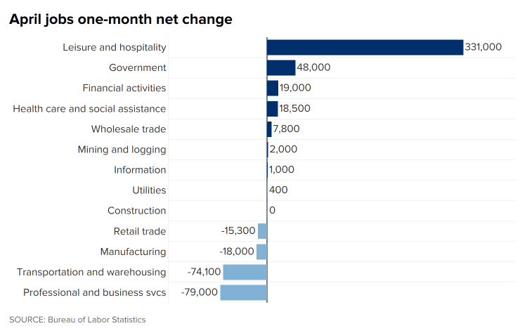 A proposito di dati occupazionali (che vedremo nel relativo capitolo) il mese di Aprile ha prodotto un ritmo anemico di assunzioni in tutti i settori esclusi il tempo libero e l’ospitalità facendo sì che il rapporto del Dipartimento del lavoro non soddisfacesse le alte aspettative di Wall Street. In particolare, l’industria manifatturiera ha perso posti di lavoro mentre l’industria delle costruzioni non ha aggiunto alcuna posizione netta nel mese. L’unico aspetto positivo è stato il settore del tempo libero e dell’ospitalità, che ha aggiunto 331.000 posti all’interno del quale, ristoranti e bar hanno continuato a sostenere la maggior parte delle assunzioni e hanno contribuito con 187.000 posti di lavoro netti, i divertimenti, il gioco d’azzardo e le attività ricreative hanno contribuito a poco più di 72.000 posti, mentre le arti dello spettacolo e gli sport per spettatori in presenza, hanno aggiunto 14.300.