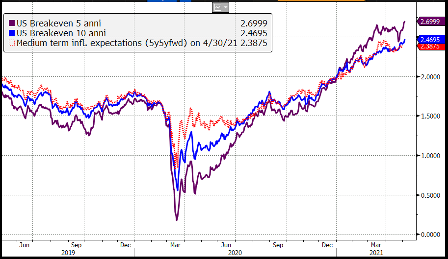 Mentre continua il movimento al rialzo delle aspettative di inflazione misurate dai breakeven a 5 e a 10 anni che hanno segnato i nuovi massimi dal luglio del 2008 e dal marzo del 2013. Per il 5 anni, segnare i massimi storici da inizio rilevazione, a fine anni 90, è questione di una ventina di basis points (vecchio record 2.91% nel marzo del 2005).