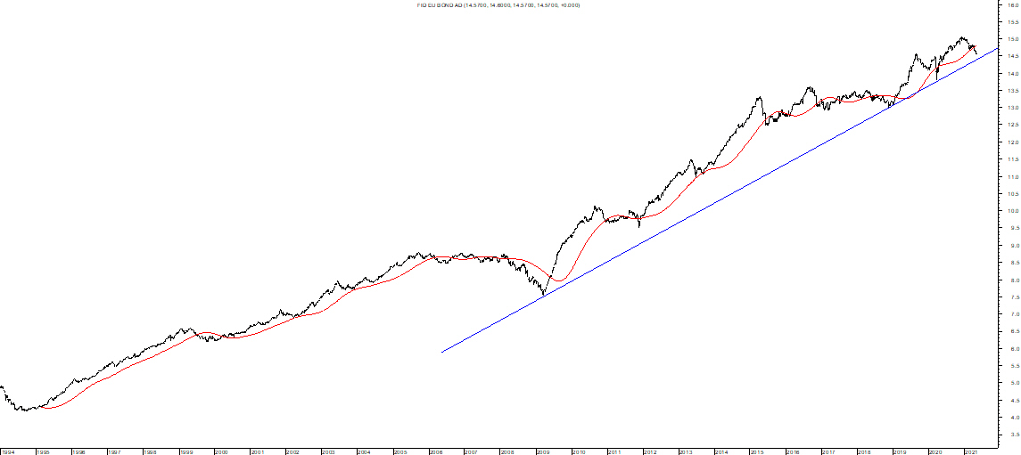 Una parentesi: intervenire su un fondo obbligazionario è meno complicato, non ho detto più facile, che intervenire su un asset azionario e, in questo caso, la semplicissima media mobile triangolare (vedi in rosso sul grafico) potrebbe essere certamente molto utile.