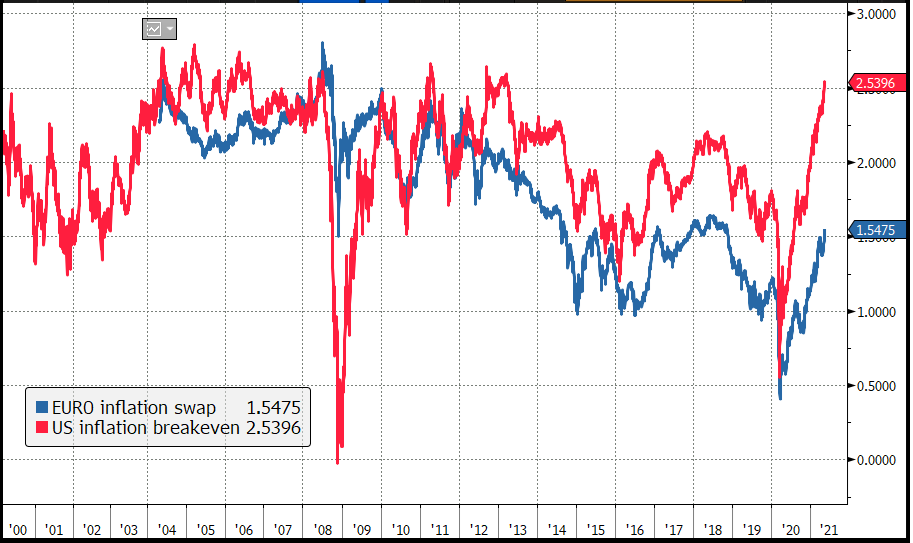 Ovviamente le aspettative di inflazione, come si nota dal grafico dei Breakeven inflation a 10 anni USA e Euro è ormai sui massimi poliennali (dal 2013 per gli USA, dal 2018 per l'Eurozona).