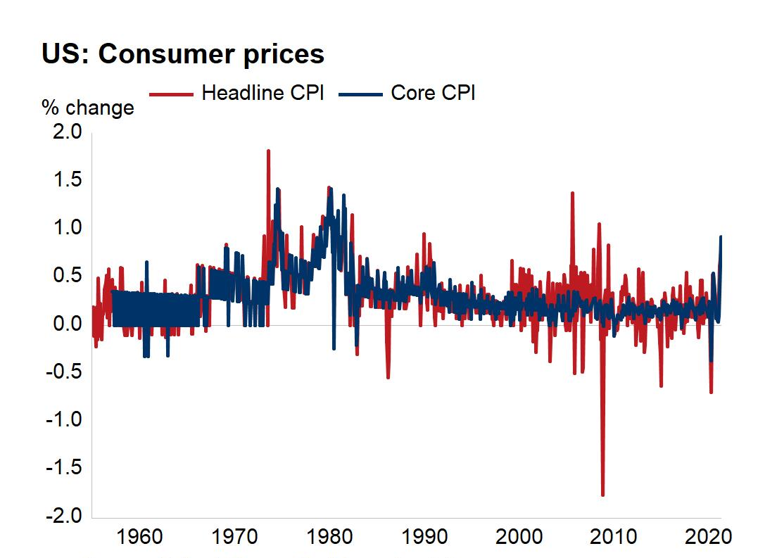 La settimana inizia con un dato "Shock". L’indice dei prezzi al consumo (CPI) sia “headline” che “core” (cioè che non tiene conto del settore alimentare e dell’energia) di Aprile sono usciti rispettivamente il quadruplo e il triplo delle attese. La crescita del +0.9% mese su mese è un record dal 1982. A livello annuale l’indice raggiunge livelli importanti (rispettivamente 4.2% e 3% per headline e core, con il consensus fermo a 3,6% e 2,3%), anche se, come noto, vi ha un ruolo l'effetto base, ovvero il paragone con i livelli depressi di 12 mesi fa. L'enorme sorpresa è principalmente dovuta ai balzi di alcune categorie in piena riapertura come Hotels (+7.6%), biglietti aerei (+10.2%), affitto auto e furgoni (+16.2). I prezzi delle auto usate sono saliti del 10.2%, producendo un terzo del rialzo totale del CPI core. E' un buon esempio di un effetto temporaneo, causato da eccessi di domanda a fronte di difficoltà di approvvigionamento (molto difficile che le auto usate continueranno a salire del 10% al mese). In questo senso, sembra evidente che gran parte del balzo è effettivamente costituita da fenomeni temporanei. I due dati sono rilasciati dall’U.S. Bureau of Labor Statistics.