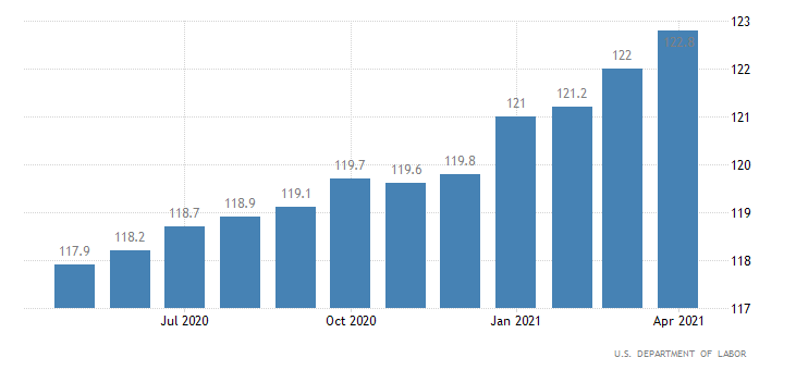 A livello mensile, il dato sulle vendite al dettaglio di Aprile ha deluso il consenso, sia come “headline”, che come “core”, che come “control group”. Il dato “headline” rimane invariato (+0,0%) contro una previsione del +1,0%. A marzo il dato era stato una “bomba” in quanto la crescita era stata del 10,7% (dato rivisto dal 9,8%). Il dato sulle vendite al dettaglio Control Group (che rappresenta le vendite totali del settore utilizzate per preparare le stime del PCE per la maggior parte delle merci), ha registrato una contrazione del -1,5% dopo il +7,6% di marzo (dato rivisto da 6,9%); il consensus prevedeva un calo dello 0,2%. In assoluto i consumi sono sulla luna ed è probabile che resteranno robusti nei mesi a venire. I due dati sono rilasciati dall’U.S. Census Bureau.