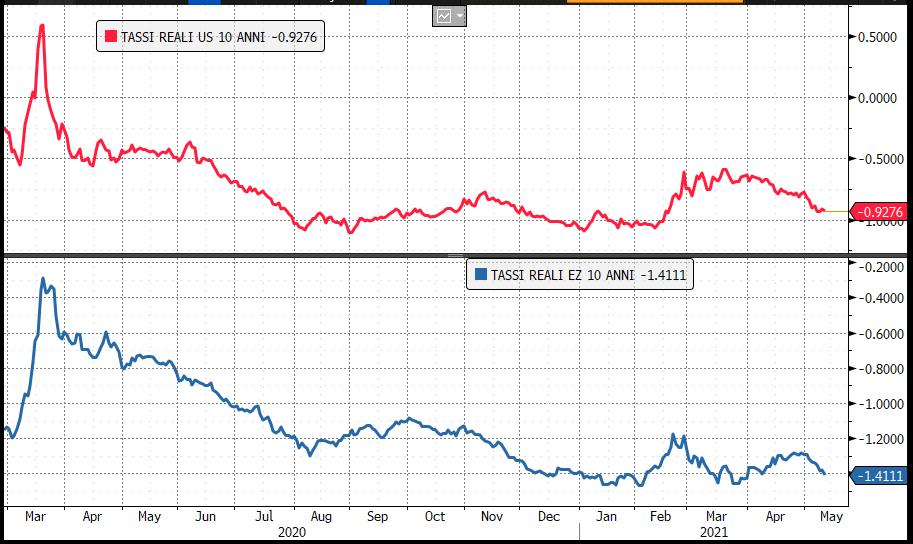 Recentemente, però, l'impatto di queste attese sui tassi nominali è meno pronunciato. Il treasury a 10 anni rende intorno a 1.6% da metà marzo e le punte sopra 1.7% oltre ad essere rare, ad eccezione di mercoledì scorso, risalgono ad oltre un mese fa. Più accentuata la salita in Eurozone dove il Bund ha effettivamente superato di 7/8 bps, il massimo di fine febbraio, collocandosi a -0.15%, livello più alto da maggio 2019, toccato brevemente a gennaio 2020. Il risultato è che i tassi reali nei 2 blocchi sono tornati sui livelli minimi di periodo, il che non è certo una brutta notizia per l'azionario e/o l'economia.