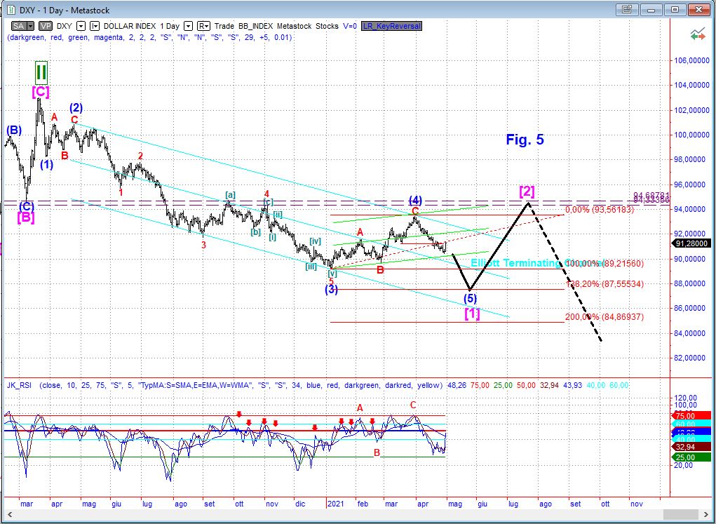 Sulle fasi iniziali di onda (3) avevamo realizzato un buon profitto con un ETF in Leva 3 Short (Codice ISIN IE00BF4TW784). Il problema è che se l’onda 4 è già terminata l’onda 5 non sarà molto lunga. Valuteremo se rientrare sulla 5 o aspettare la (5) di grado superiore.
