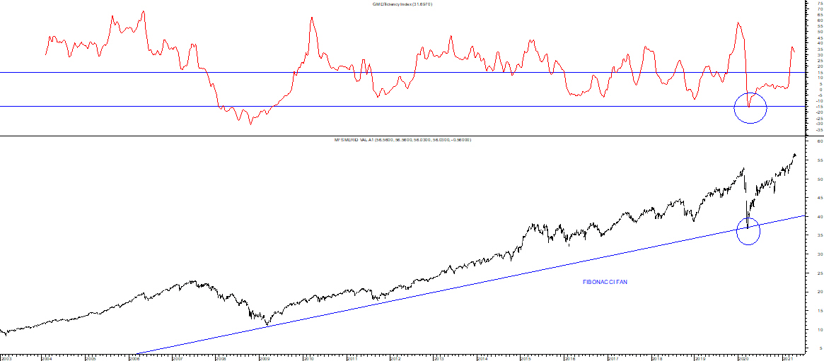 Inoltre, una reta sembra inserita a caso sul grafico del nav, ma è una Fibonacci fan ricavata dal periodo che va dal mese di marzo 2009 al massimo di febbraio 2020. Tale supporto è stato interessato per due settimane, in corrispondenza del test di -15 dell’Efficiency index, prima di dare inizio alla fase di recupero tuttora in essere.
