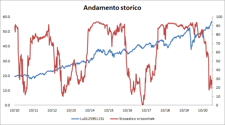 Vediamo per esempio che, durante il primo lockdown, il nav ha perso molto (da 53.08 a 36.60), ma lo Stocastico orizzontale è rimasto su livelli decisamente elevati. Si è dunque comportato benissimo all’interno del paniere di riferimento ed è che quello che cerchiamo.