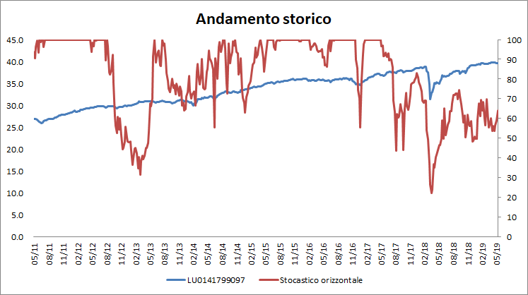 Questo fondo vanta la maggior permanenza dello Stocastico orizzontale al di sopra di 70, ossia 69.4%, evidenziando di trovarsi spesso tra i fondi con il maggior rendimento a 12 mesi.