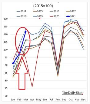 E tutto questo quando a Manhattan gli appartamenti sono praticamente vuoti. L’impressione è che ci stiamo tutti avviando verso una bolla economica di proporzioni mai viste. E se considerate che l’Organizzazione Mondiale della Sanità, per quel che vale dopo la perdita di credibilità subita durante la pandemia, calcola che i morti per COVID siano il doppio o il triplo di quelli ufficiali. Quindi diciamo che con i nostri 125.000 morti ufficiali in Italia moltiplicati per 3 abbiamo il numero di morti della seconda guerra mondiale in Italia e quindi vivremmo di nuovo un boom post bellico. Questa bonanza sta arrivando anche in Europa e se notate il grafico qui sotto della produzione nel settore costruzioni vedete come la linea blu a marzo 2021 abbiamo un andamento completamente divergente dagli anni passati: una rondine non fa primavera ma possiamo sicuramente dire che è meglio così che un andamento divergente al ribasso.