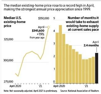 A guardare i dati del mercato immobiliare USA viene da sorridere. Per vendere casa nel mese di aprile 2021 ci sono voluti 17 giorni con il record di Indianapolis dove ce ne sono voluti solo 4. Le case con prezzo superiore ad un milione di dollari hanno visto triplicare le vendite ad aprile 2021 rispetto da un anno prima. E il Wall Street Journal mostra fotografie con code di decine di coppie in fila per fare il sopralluogo ad una villetta di modeste dimensioni in una periferia di una grande metropoli. Anche in Italia i prezzi immobiliari sono in aumento ma a macchia di leopardo e c’è chi vede comunque davanti a noi un futuro radioso. Ma la frenesia immobiliare degli Usa è sideralmente lontana. I prezzi del mercato immobiliare sono il +19% rispetto a quelli di un anno fa come dimostra il grafico qui sotto tratto dal Wsj: