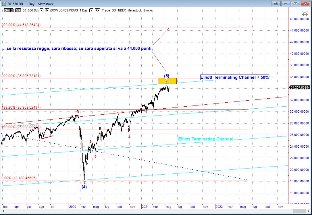 Come vediamo in questo grafico il massimo del 10 maggio è entrato nella fascia di resistenza offerta dalla trendline del canale di Elliott aumentato del 50% e dalla proiezione del 200% di onda (4). A questo punto come dicono i vecchi dalle nostre parti “o si va o si sta” , nel senso che abbiamo due resistenze (quella offerta dal gap e questa doppia illustrata qua) per cui o il rialzo dei prezzi termina addosso a queste resistenze e inizia il bear market oppure data l’enorme liquidità che gira i prezzi rompono tutto e tirano dritti e in questo caso si va verso i 44.600 punti.