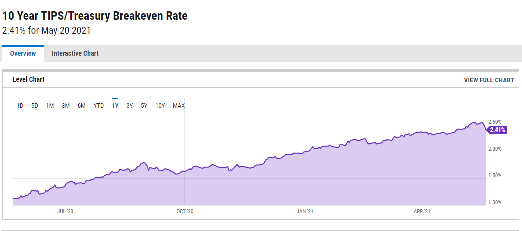Le aspettative di inflazione, come si nota dal grafico del Breakeven inflation a 10 anni USA è sceso in settimana dai massimi del 2,54%.