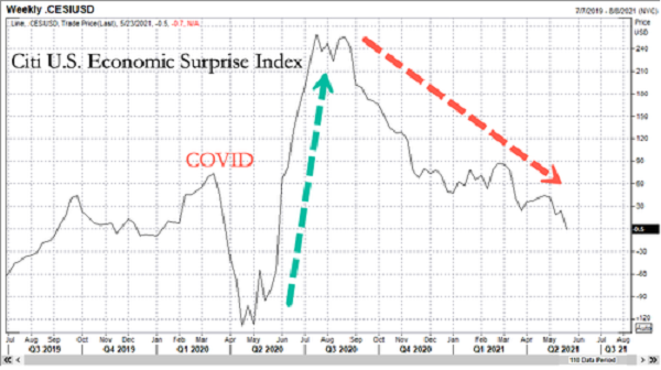 Oltre a una raffica di dati economici deludenti, tra cui il recente dato sui prezzi al consumo (CPI) più caldo del previsto, la vendita di nuove abitazioni sono diminuite ad aprile e l'indagine sulla produzione della FED Bank di Philadelphia che ha mancato le aspettative, l'indice a sorpresa è diventato rosso. L'indice non è una misura imperativa della crescita, ma fornisce una visione della forza della ripresa economica. Diventare rosso non è una cosa terribile per l'indice, né significa che la ripresa sta precipitando, ma tutto ciò che suggerisce è che i dati macro non stanno più battendo le stime degli analisti al rialzo.