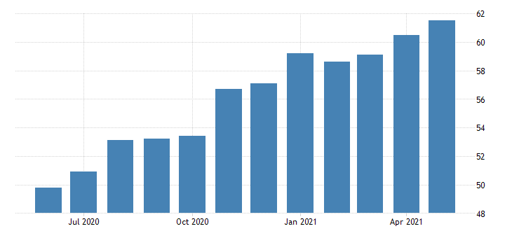 Il PMI manifatturiero mensile preliminare elaborato da Markit Economics evidenzia una crescita, con il dato che tocca quota 61,5 contro un consensus a 60,2, che prevedeva quindi una leggera contrazione dal 60,5 di aprile. Mentre il dato preliminare mensile relativo al settore dei servizi segna un record storico a 70,1, dai 64,7 punti di aprile; il consensus si attestava a 64,5.