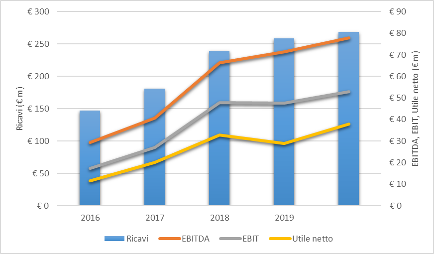 I ricavi del Gruppo sono cresciuti a un CAGR (tasso medio annuo composto) del 16.3% dal 2016 al 2020. L’EBITDA, l’EBIT e l’utile netto sono cresciuti rispettivamente a un CAGR rispettivamente pari al 27.7%, 32.0% e 34.4% nello stesso periodo.