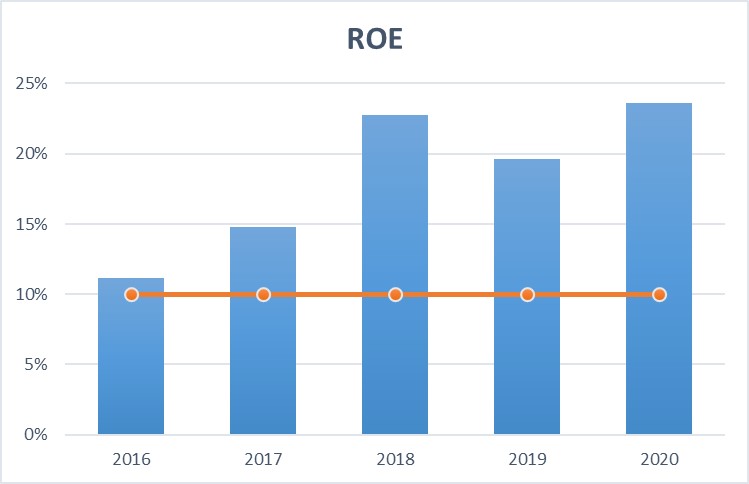 Ottima la redditività dei mezzi propri: negli ultimi cinque anni il ROE si è mantenuto stabilmente sopra il 10%.
