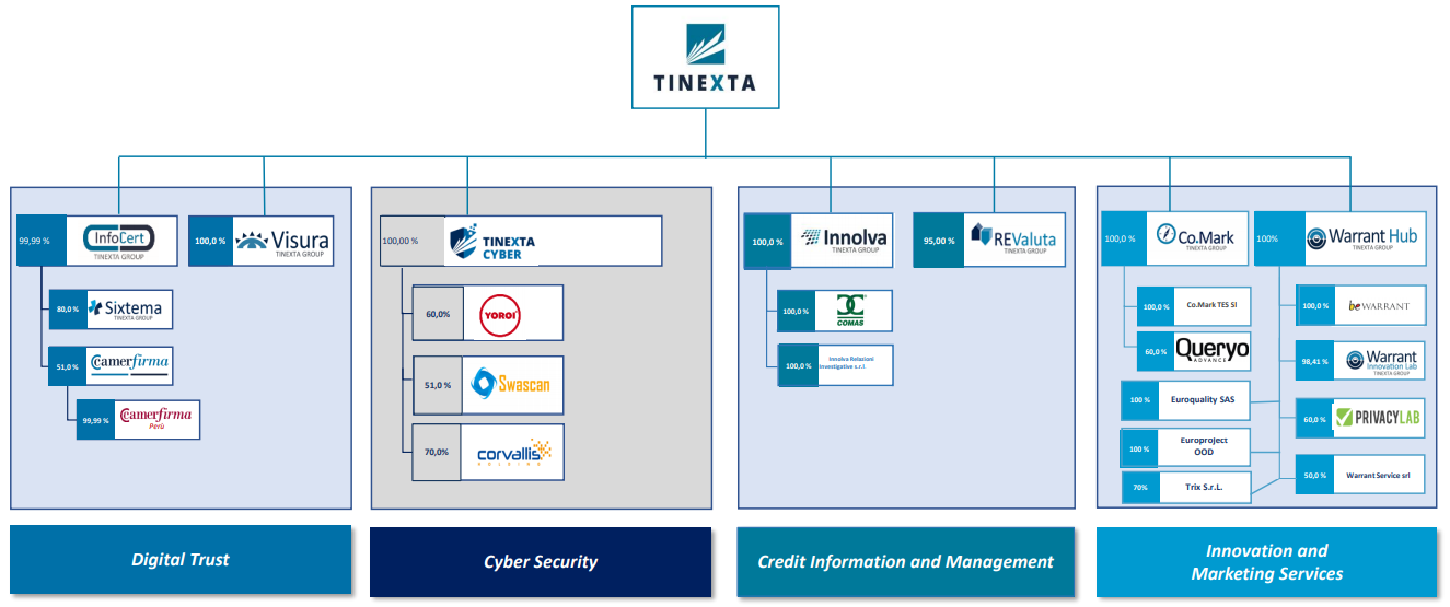Infine, nell'ottobre 2020 Tinexta entra anche nel mercato della Cyber Security attraverso l’acquisizione di tre aziende già operanti nel settore attraverso l’offerta di soluzioni personalizzate e proprietarie per la mitigazione e il governo dei rischi legati al settore digitale.