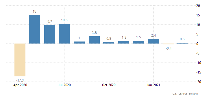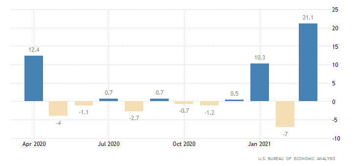 Mostruosa la crescita del dato sul reddito personale, gonfiato dagli assegni del pacchetto fiscale. Dopo la contrazione di febbraio con un -7% (rivisto da -7,1%), a marzo si registra un +21,1%, appena sopra il consensus fissato a 20,3%. Il dato è rilasciato dall’U.S. Bureau of Economic Analysis.