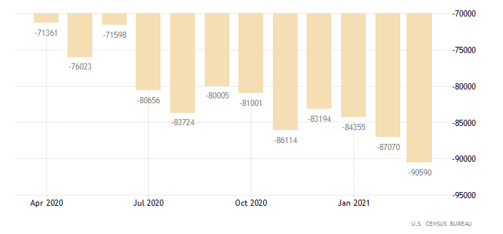 Un’altra prova che lo stimolo fiscale USA sta, almeno in parte, andando all'estero viene dalla bilancia commerciale delle merci che a marzo ha mostrato un deficit di 90.6 mld $, in rialzo di 3.5 mld da febbraio e 2.6 mld $ oltre le attese. Le esportazioni sono salite parecchio (+11.4 mld $) a indicare una domanda globale solida. Ma l'import, spinto dallo stimolo, ha fatto decisamente meglio (+14.9 mld $) col risultato che il deficit è il massimo di sempre.