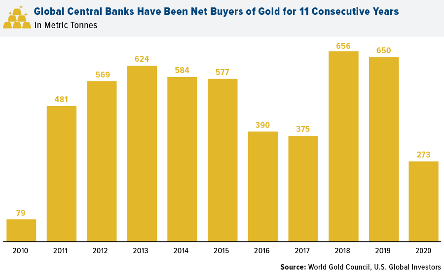 Le banche centrali sono state acquirenti netti di oro per 11 anni consecutivi. Secondo i dati del World Gold Council (WGC), le banche centrali di tutto il mondo hanno acquistato 272,9 tonnellate di lingotti nel 2020. Gli acquisti dello scorso anno sono stati del 60% inferiori rispetto alle 668 tonnellate, record raggiunto nel 2019. La pandemia ha costretto alcune banche centrali a vendere parte delle proprie riserve e iniettare liquidità nelle loro economie. Gli acquisti si sono concentrati nella prima metà dell'anno, poi sono diventati quasi inesistenti nel terzo trimestre e sono ripresi negli ultimi tre mesi dell'anno.