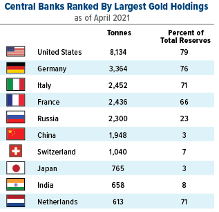 Le prime 10 banche centrali con le maggiori riserve auree sono rimaste sostanzialmente invariate negli ultimi anni. Gli Stati Uniti detengono il primo posto con oltre 8.000 tonnellate d'oro nei loro caveau - quasi quanto i prossimi tre paesi messi insieme - e rappresentano il 79% delle riserve totali. Gli unici paesi in cui l'oro rappresenta una percentuale più alta delle riserve sono il Portogallo all'80,1% e il Venezuela all'82,4%.