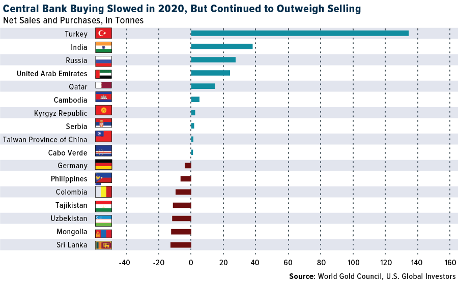 10 banche centrali hanno effettuato acquisti netti di una tonnellata o più nel 2020, evidenziando la continua domanda di metallo prezioso. La Turchia è stata l'acquirente numero uno per il secondo anno consecutivo - aggiungendo 134,5 tonnellate - ed è stato anche il più grande venditore dopo aver ridotto le aziende di 36,3 tonnellate. Le vendite di banconote del WGC si sono concentrate tra un piccolo numero di banche centrali che acquistano oro dalla produzione interna, tra cui Mongolia e Uzbekistan.