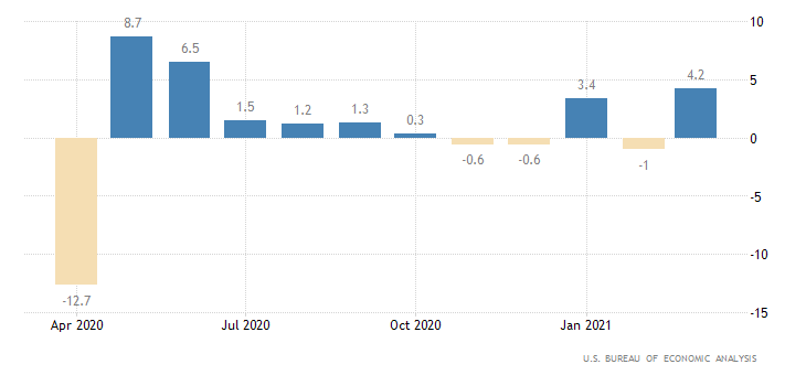 Forte il dato mensile sulle spese personali, che a febbraio aveva registrato una flessione dell’1%, e a marzo cresce del 4,2% registrando un dato appena superiore alle attese (consensus 4,1%). Il dato è rilasciato dal Bureau of Economic Analysis.