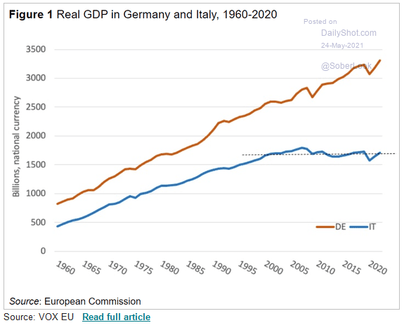 Del resto questo non è una novità e se paragoniamo la crescita del PIL tedesco a quella del PIL italiano (linea blu) la risposta del perché i motori della nave siano ormai fuori uso ve la date da soli: