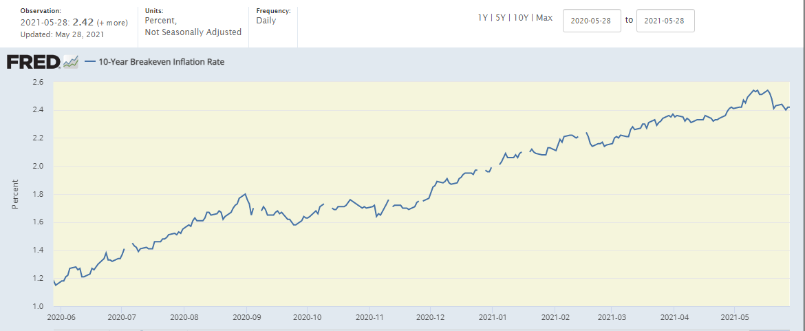 Rimangono in linea con la chiusura della scorsa settimana al 2,42%, le aspettative di inflazione. Il dato è sceso in settimana dai massimi del 2,54% come si può notare dal grafico del Breakeven inflation a 10 anni: