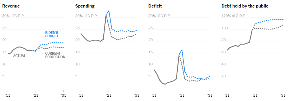 L’intenzione del presidente Biden è quella di finanziare l’agenda economica tramite un aumento delle tasse sulle società e sui redditi alti. Biden ha affermato che non aumenterà le tasse alle persone che guadagnano meno di 400 mila dollari all’anno. Secondo la proposta del presidente, il deficit del bilancio federale nel 2022 raggiungerebbe 1,8 trilioni di dollari.