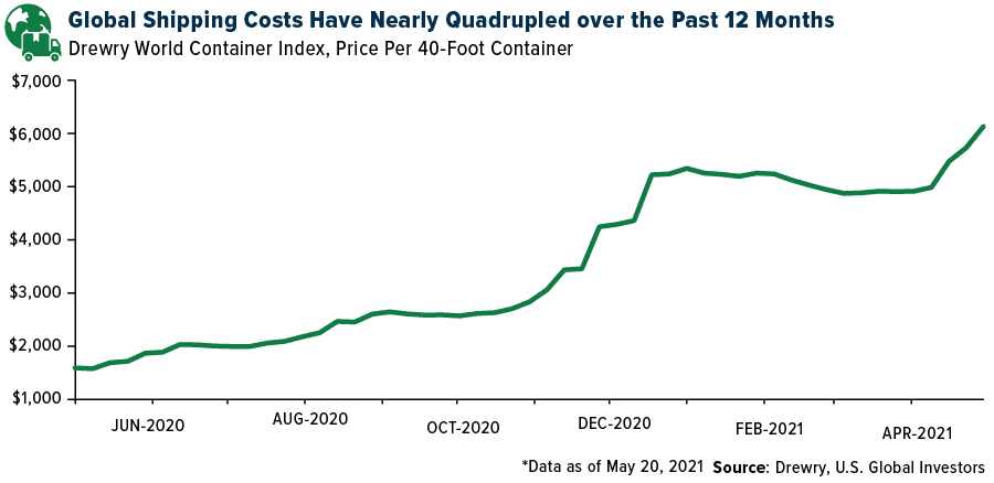 L'indice dei prezzi pagati dalla Philly Fed è salito a 76,8 questo mese, il valore più alto dal marzo 1980. I costi del carburante sono aumentati anche a seguito dell'attacco informatico al gasdotto coloniale, che fornisce il 45% della fornitura di Gas al sud-est del Paese. Nella settimana appena trascorsa il prezzo del Gas ha superato i 3 $ al gallone, il massimo dal 2014 quando il prezzo raggiunse i 3,66 $/gallon. Inoltre gran parte degli aumenti di prezzo potrebbero essere correlati a costi di spedizione record. La richiesta per spedire un container continua a salire poiché la domanda supera di gran lunga l'offerta. Il Drewry World Container Index è aumentato del 7% durante la settimana terminata giovedì scorso per toccare $ 5.193, un aumento di quasi quattro volte rispetto all'anno precedente (v.grafico):
