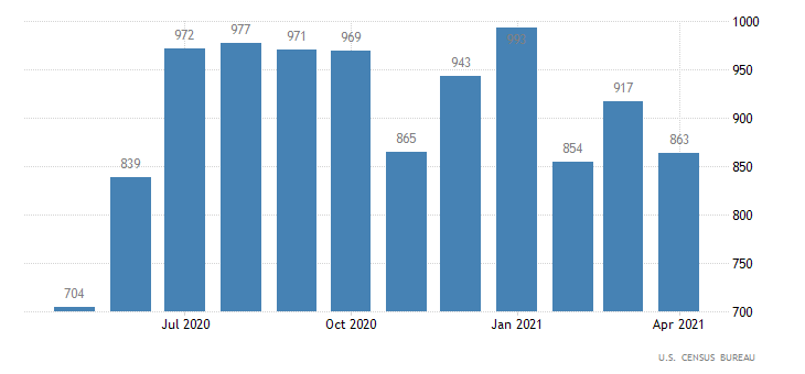 Nel mese di aprile la vendita di nuove case registra un -5,9%, passando dalle 917 mila nuove abitazioni vendute a marzo (dato rivisto da 1.021.000) alle 863 mila di aprile. Il dato è rilasciato dall’U.S. Census Bureau.