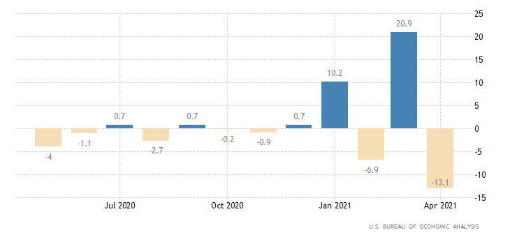Pesante contrazione per il dato sul reddito personale, che ad aprile registra un -13,1%; calo più contenuto rispetto a quanto previsto (il consensus era fissato a -14,1%). A marzo era stato registrato un +20,9% (rivisto da 21,1%). Il dato è rilasciato dall’U.S. Bureau of Economic Analysis.