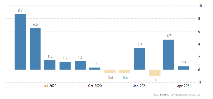 Il dato preliminare annualizzato sul primo trimestre del PIL segna un +6,4% restando in linea con il dato preliminare precedente (sempre al 6,4%), deludendo però leggermente le attese, con un consensus che era fissato al 6,5%. Nell’ultimo trimestre del 2020 il PIL aveva segnato un +4,3%. Il dato è rilasciato dall’U.S. Bureau of Economic Analysis.