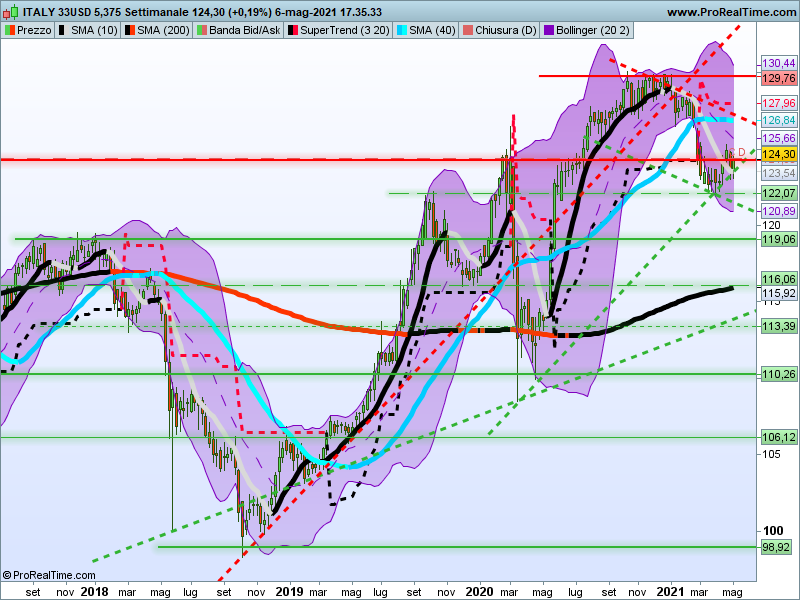 Superato il 3% di rendimento un obiettivo 4%, per quanto ancora ipotetico, appare possibile. D’altra parte è sceso sotto questo livello nel maggio 2020 e se ci ritornasse ciò equivarrebbe a un calo sotto i 120 Usd, contro i 124 in corso.