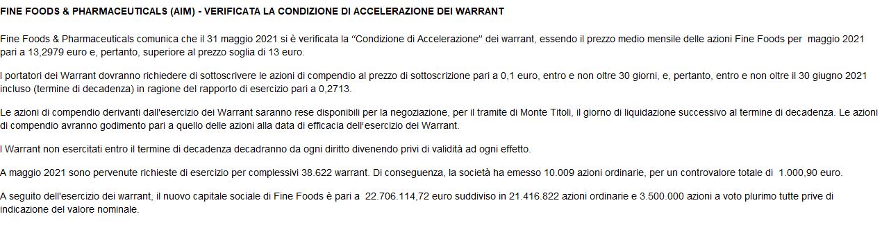 Nella seduta odierna è poi uscito il comunicato ufficiale di Fine Foods relativo alla verificata condizione di accelerazione dei warrants e quello che salta fuori è il valore che Vi avevo già calcolato nell'articolo di sabato scorso: rapporto di esercizio pari a 0.2713.