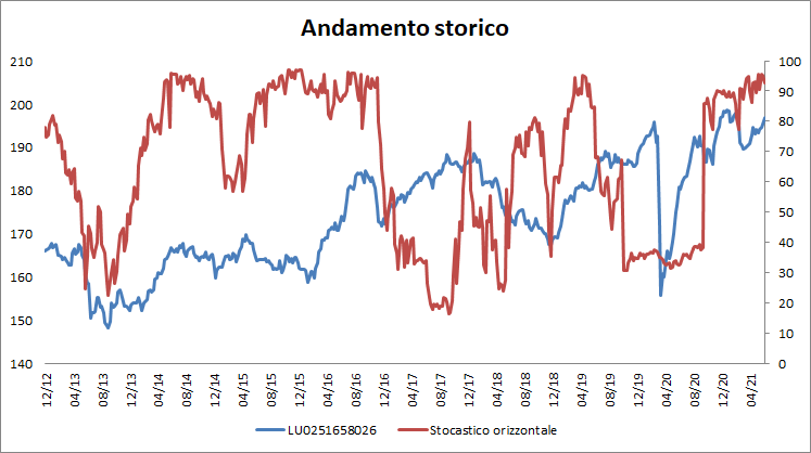 Abbiamo pertanto un fondo che ha dimostrato la sua affidabilità attraverso lo Stocastico orizzontale dopo essere stato confrontato con altri 34 asset storici del settore, mentre l’analisi tecnica indica un trend ascendente in essere e un supporto nelle immediate vicinanze di 190. Tuttavia, questo è il momento di mantenere, mentre il superamento di 200 circa (livello psicologico molto importante in prossimità dell’attuale massimo storico di 199.03) potrebbe costituire un nuovo segnale di ingresso.