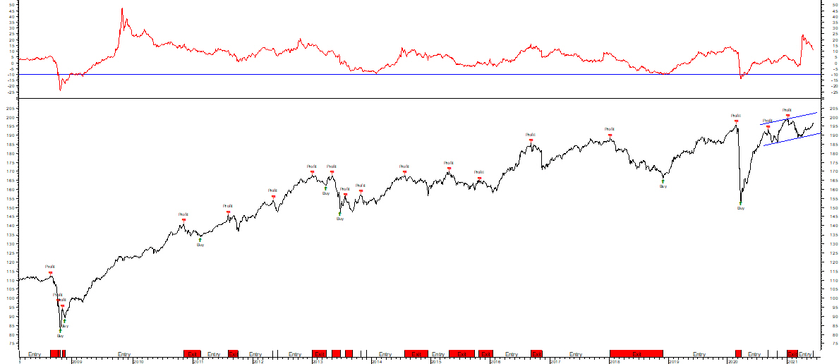 Il grafico del nav è correlato da segnali di ingresso che prendono in considerazione, tra le varie cose, la volatilità, e segnali di uscita che possono essere utilizzati anche in una strategia di switch.