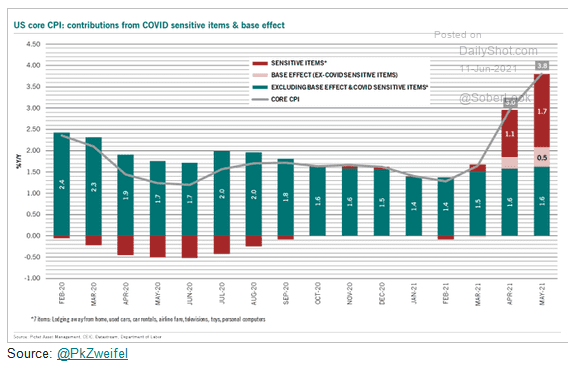 Il tema dominante della settimana scorsa è stata l’inflazione. L’inflazione è ovunque: nei prodotti industriali, nelle materie prime, nei prodotti da esportazione cinesi e via andare. Ovunque eccetto nel mercato dei bond che ancora non prezzano la fine del mondo, anzi i rendimenti dei Treasuries americani h anno toccato un minimo proprio nella settimana passata. E questo perché ? Per due ragioni: la prima è che il rialzo dell’inflazione è dato da componenti transitorie legate alla pandemia e il grafico che vi posto è davvero illuminante perché la componente rossa dell’istogramma vi mostra appunto i prezzi dei beni relativi alla pandemia: