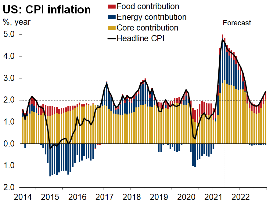 Rialzo a parte è facile immaginare che i numeri odierni saranno snobbati dalla FED quanto i precedenti, perchè mostrano caratteristiche simili, con un grosso contributo di categorie che chiaramente risultano temporaneamente distorte. La percezione è che questo sarà il picco dell'inflazione per questo ciclo e ciò lascia intendere che il peggio è alle spalle e i prossimi dati saranno più benigni (v. grafico):