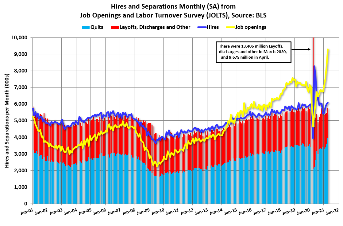 Per quanto riguarda il mercato del lavoro, il principale problema dei piccoli imprenditori sembra essere quello di reperire manodopera, con quasi la metà che si dichiara incapace di assumere i lavoratori necessari. Il capo economista Dunkelberg del NFIB (National Federation of Independent Business) ha dichiarato che le ditte stanno alzando le remunerazioni e che i costi in aumento stanno venendo trasferiti ai clienti. Le aperture di posizioni lavorative hanno fatto segnare ad Aprile (proprio il mese in cui i nuovi occupati sono stati di 650.000 unità inferiori alle attese) il nuovo record storico, con 9.286.000 posizioni, circa un terzo in più dei livelli pre-pandemia. Le separazioni volontarie sono state quasi 4 milioni, un altro massimo storico, a dimostrazione di un mercato molto dinamico, mentre i licenziamenti sono ai minimi storici (vedi grafico):