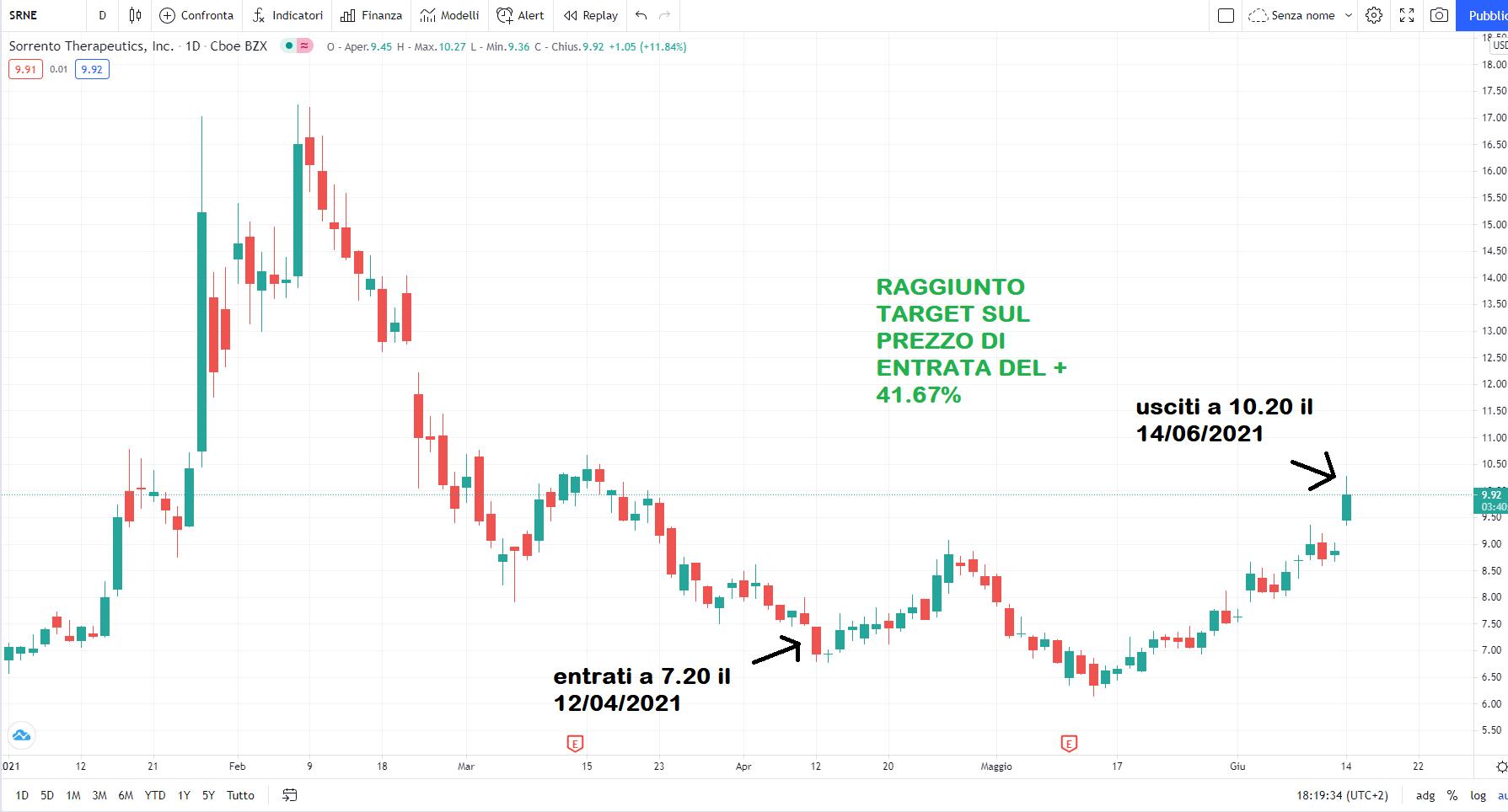 Il secondo target raggiunto invece è quello sull’azienda biofarmaceutica californiana Sorrento Therapeutics, quotata sul mercato azionario americano (NASDAQ100), codice ISIN US83587F2020.